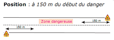 Pour être efficace, la signalisation doit être mise en place dans les deux sens de circulation à l'aide de panneaux réglementaires rétro réfléchissants, lestés et implantés judicieusement en accotement pour éviter d'être salis.