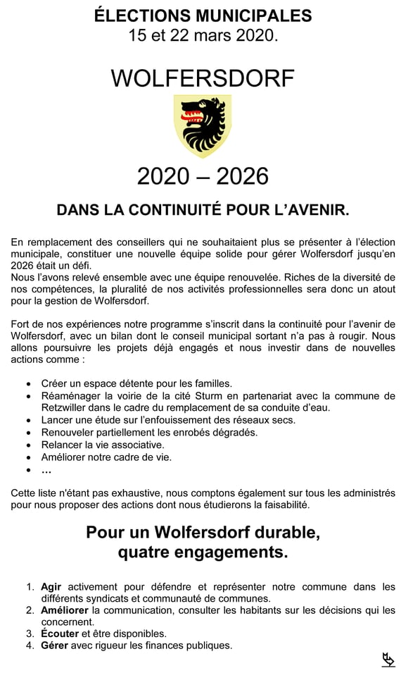 Alors même que le contexte a fragilisé cette consultation, cette échéance électorale à démontrer l'intérêt que portent les habitants de WOLFERSDORF à leur commune et leur capacité à se mobiliser, dès lors qu'il s'agit de s'engager et d'engager leur avenir.