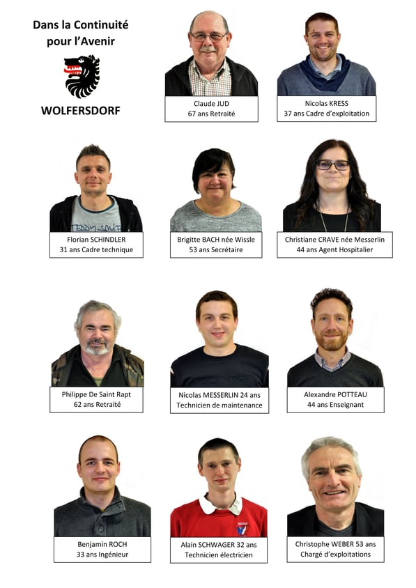 Je remercie également toutes celles et ceux de l'ancienne équipe pour le travail accompli, qui n'ont pas souhaité se représenter, et en particulier Francis Messerlin qui a cumulé 33 années de présence au conseil municipal de Wolfersdorf.