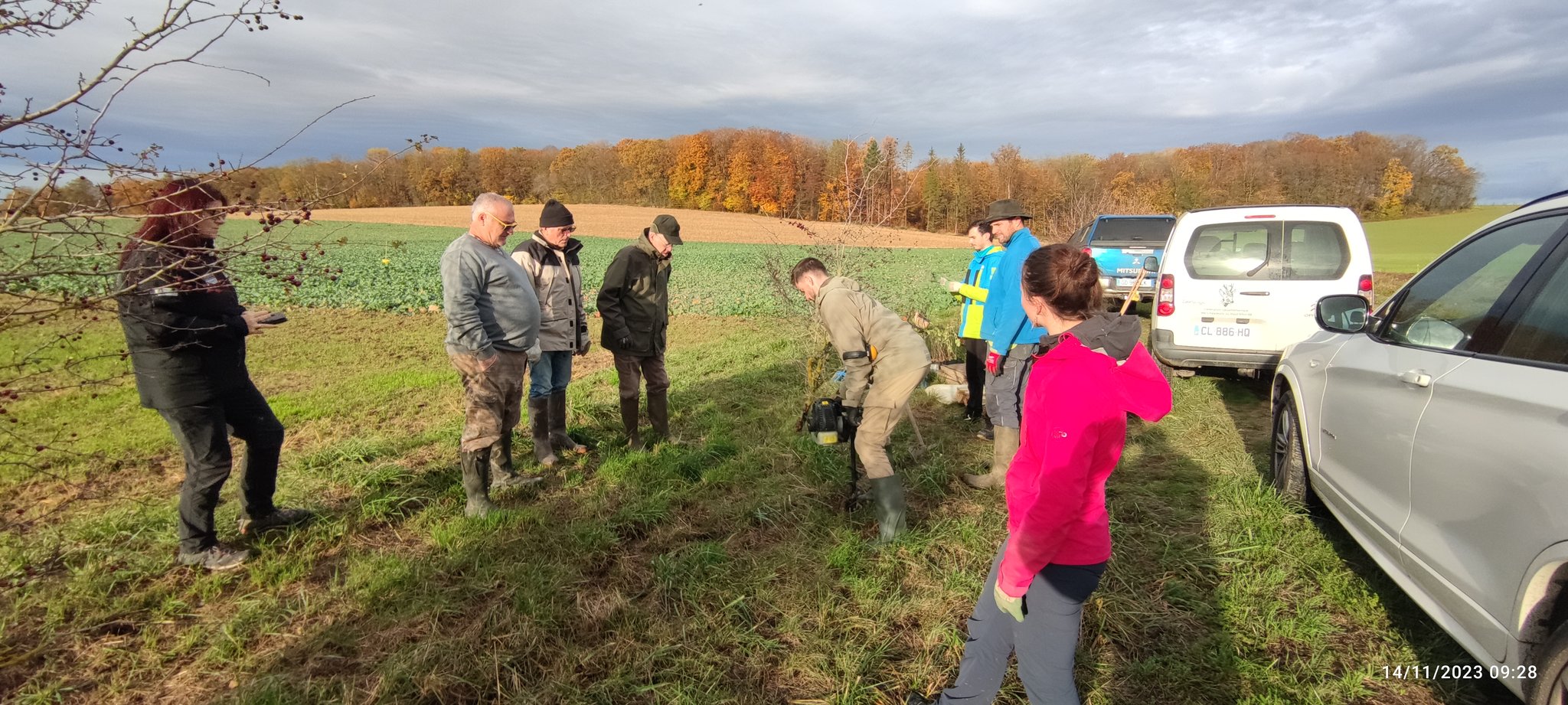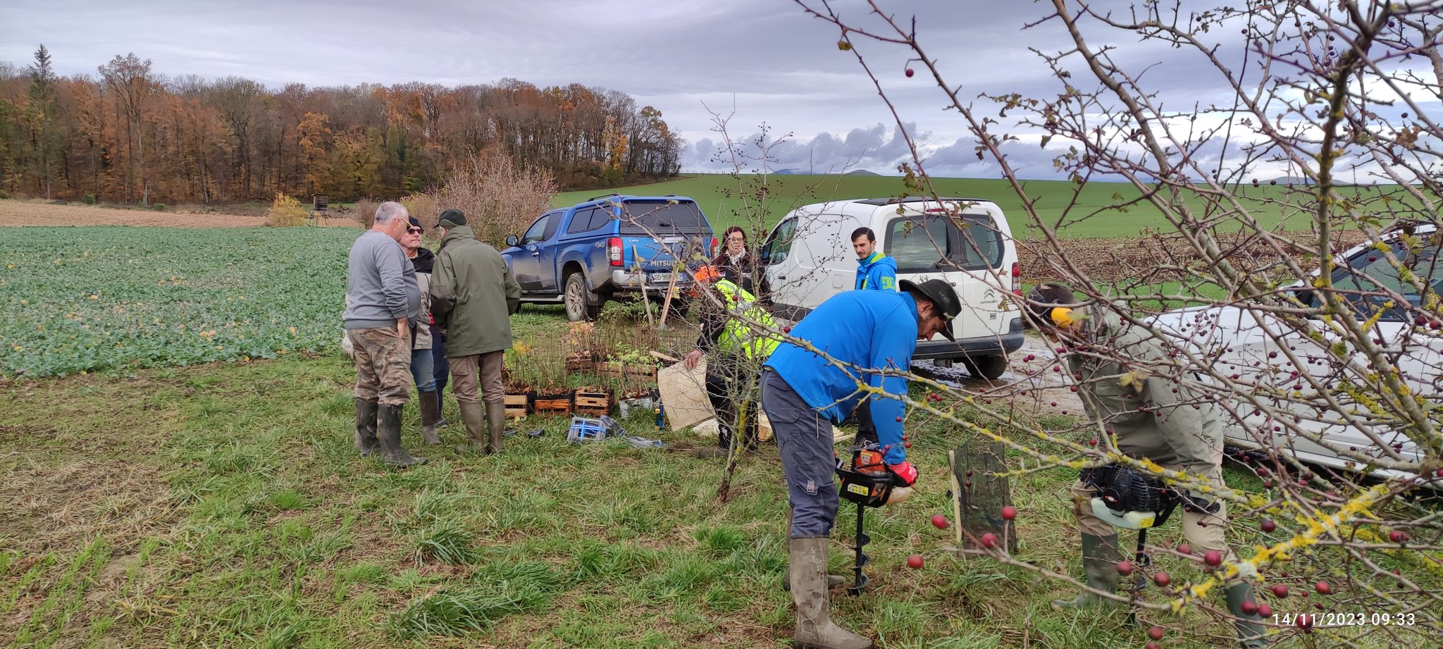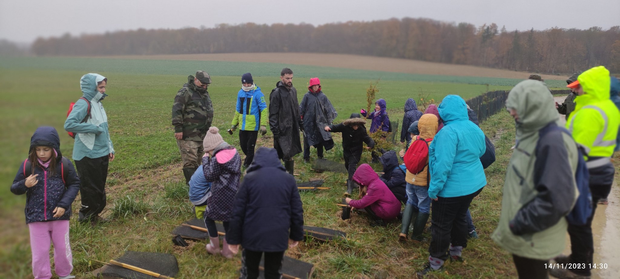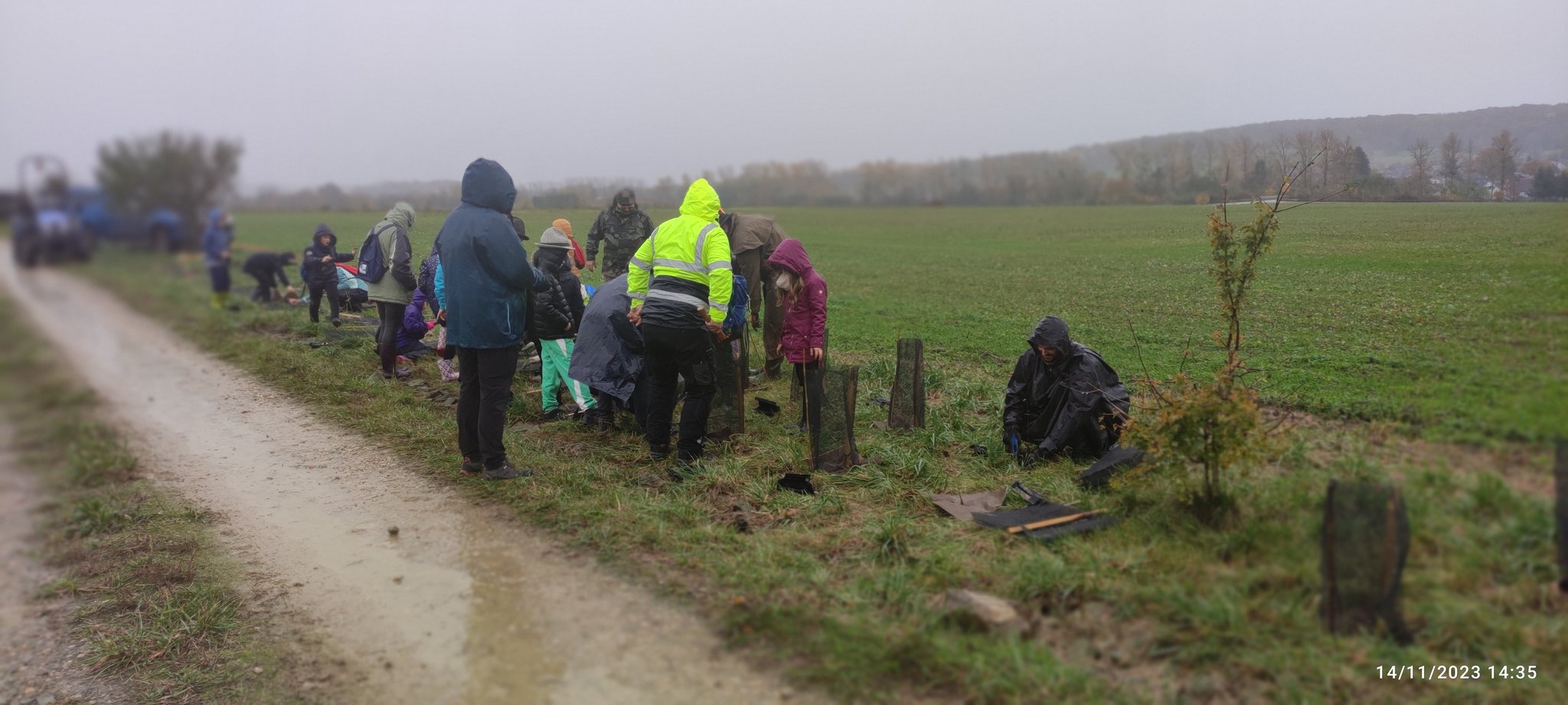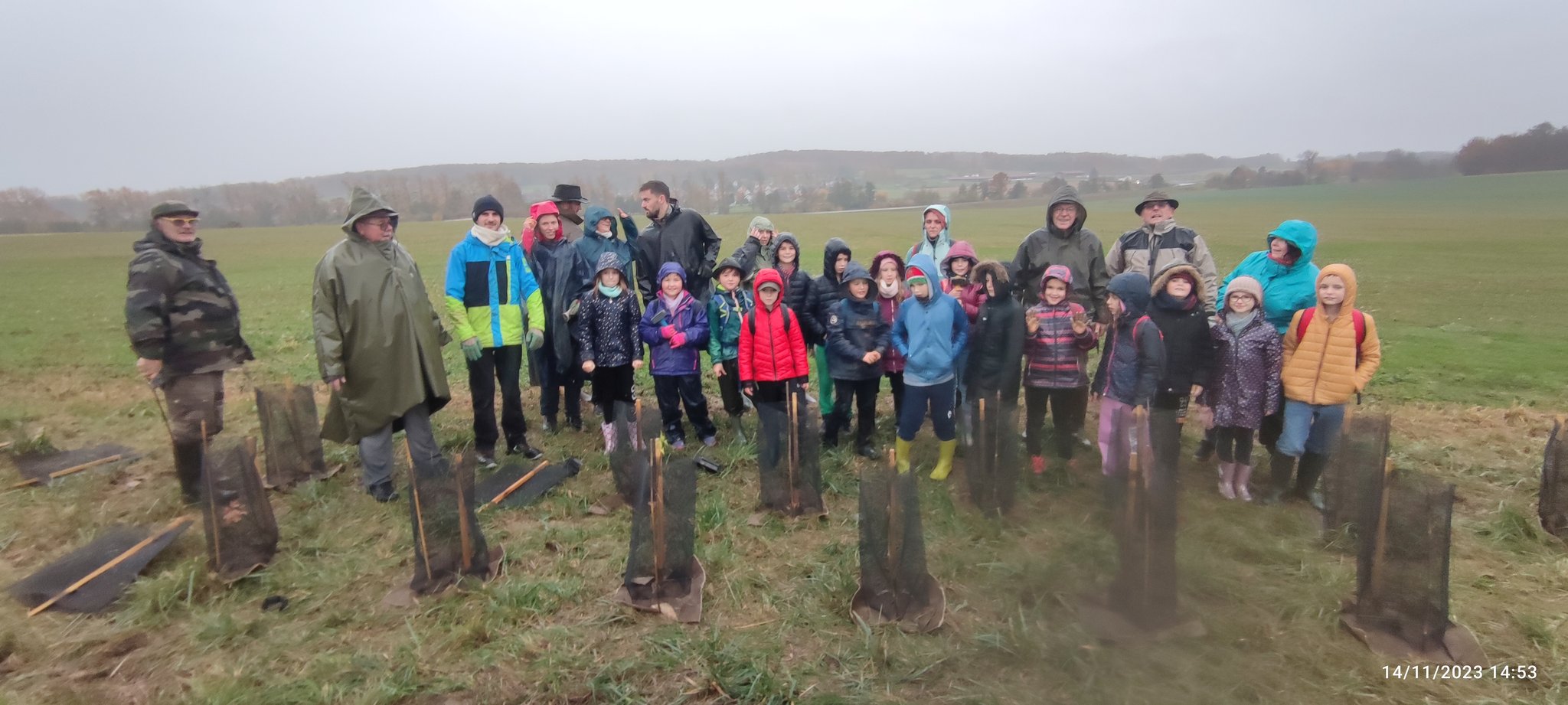 A la sainte Catherine tout bois prend racine, et à la Sainte Sidonie aussi. A l'initiative du maire et des adjoints, et le concours de la fédération départementale des chasseurs du Haut-Rhin qui offre les plants, une pluie fine et pénétrante n'aura pas empêché les chasseurs locaux, le 1er adjoint Nicolas Kress et la conseillère Christiane Cravé, les classes de CM1 et CE2 d'Aline, d'assurer la plantation de plus de 250 de moyennes et hautes tiges le long d'un chemin sur un territoire de la commune. Un deuxième session aura bientôt lieu pour finaliser ce premier effort de renaturation de nos plaines, avec les classes de CP et CE1 de Sophie Gerriet cette fois.
