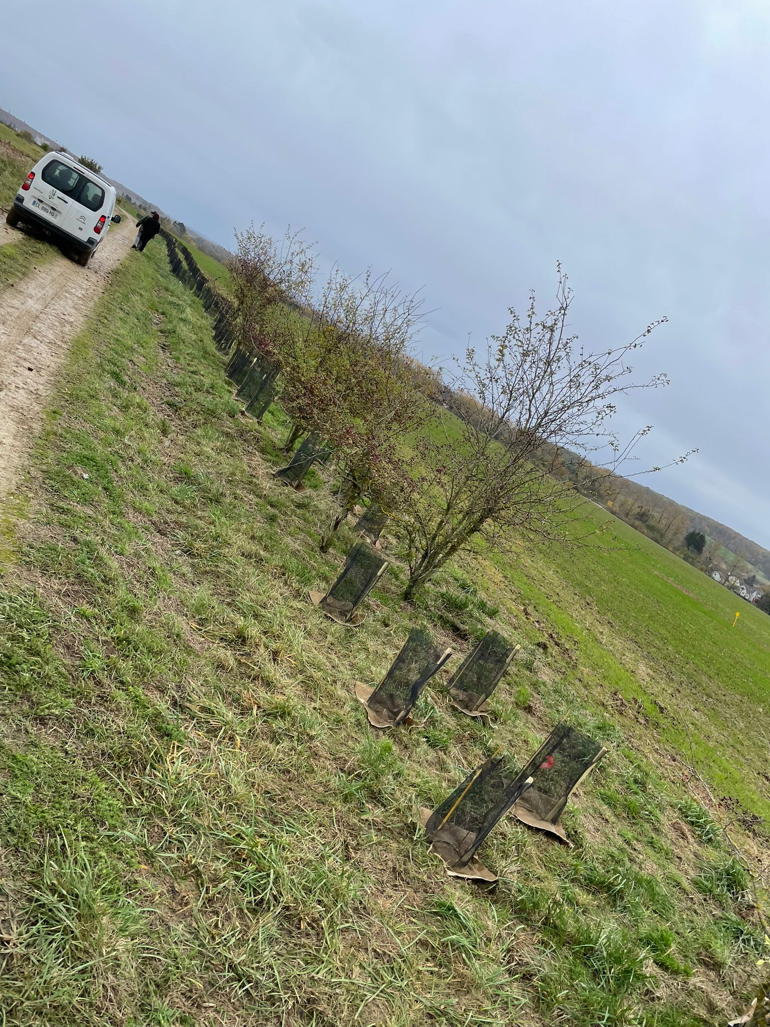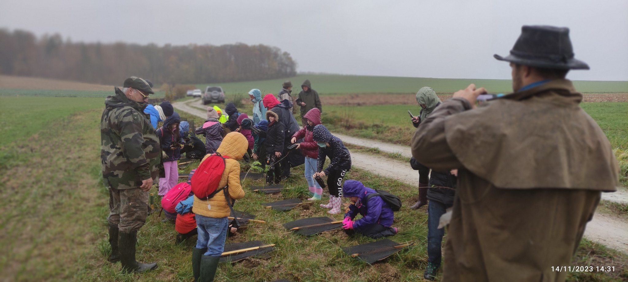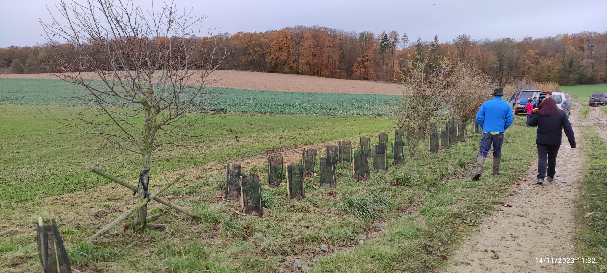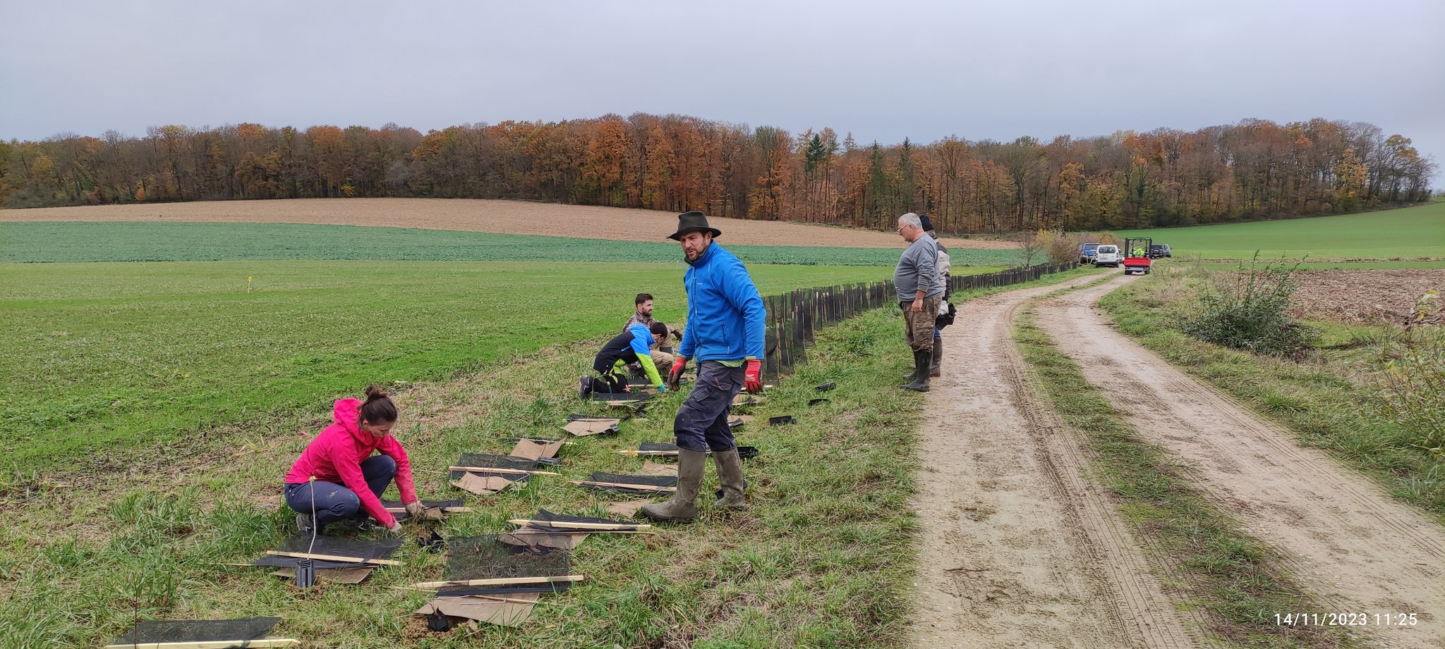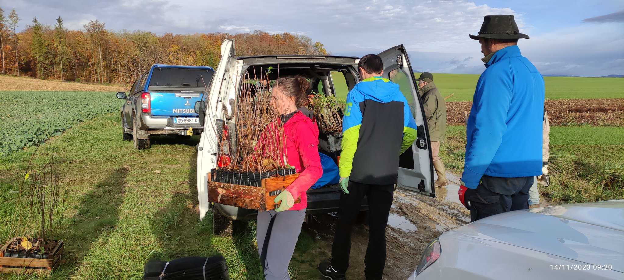 A la sainte Catherine tout bois prend racine, et à la Sainte Sidonie aussi. A l'initiative du maire et des adjoints, et le concours de la fédération départementale des chasseurs du Haut-Rhin qui offre les plants, une pluie fine et pénétrante n'aura pas empêché les chasseurs locaux, le 1er adjoint Nicolas Kress et la conseillère Christiane Cravé, les classes de CM1 et CE2 d'Aline, d'assurer la plantation de plus de 250 de moyennes et hautes tiges le long d'un chemin sur un territoire de la commune. Un deuxième session aura bientôt lieu pour finaliser ce premier effort de renaturation de nos plaines, avec les classes de CP et CE1 de Sophie Gerriet cette fois.